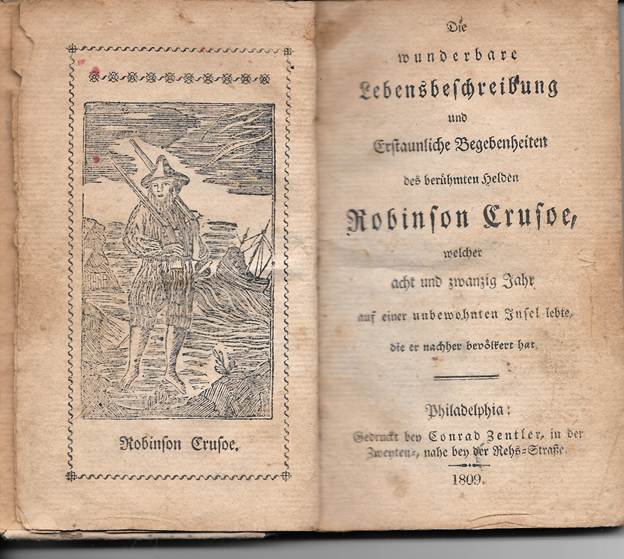 One of the treasures I did buy was a peddler’s edition of Daniel Defoe’s Robinson Crusoe in German, printed in Philadelphia in 1809. Think nineteenth-century mass market paperback. The book is small, with an unadorned cover (although still intact after more than two hundred years), and completely marred by someone who, with a red felt-tipped pen, wrote “1809” on the first blank page. Here is the title page. You can see some of the red in the illustration where it bled onto this page.