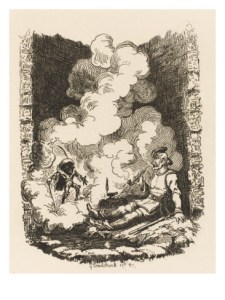 Imprisoned, separated from his Blue Light, the soldier’s last resource is one ducat. This is all he needs to bribe an old comrade of his to retrieve his pipe, tobacco, and Blue Light from the inn. After the king’s judges condemned the soldier to death for his high jinx, he asks to be allowed to have one last pipe. As the smoke rises, the black dwarf appears with a cudgel. In the 1815 version of the story, the black dwarf beats the judges to death, but by 1857 Wilhelm has softened this to simply beating them to the ground. In both versions, the king pleads for leniency and surrenders his kingdom and his daughter to the soldier.