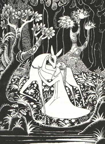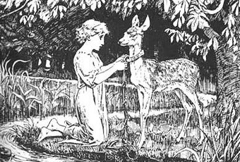 The sister weaves a rope out of rushes and uses her golden garter as a collar. Why the stepmother, who hates the children, allows her to wear gold goes without explanation. They find an unoccupied cottage and move in. All is well for some time until the king and his men appear in the forest to hunt. The fawn, hearing the hunting horns, cannot be satisfied until he joins the hunt. For three days the king chases him, and by the third day they discover the cottage and the sister. Immediately the king proposes marriage