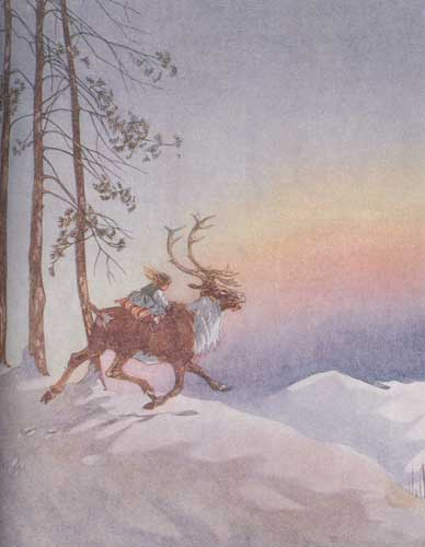 On evening two and story four, a crow tells Gerda he thinks he knows Kai, but the lad turns out to be a prince. The prince and his princess help Gerda by giving her a golden coach in which to travel. It is immediately set upon by robbers (story five), who kill the coachman and the footmen. The old robber woman wants to eat Gerda, but the robber daughter claims Gerda as her playmate. After hearing Gerda’s story the robber girl arranges Gerda’s escape, giving her a reindeer who knows where the Snow Queen’s castle stands. Despite all the action, Thalia nods off.