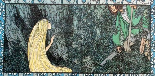 “In the Grimms’ own notes they point to a variant in which the antagonist is a woman dressed in black, traveling in a black coach, and living in a black castle. Nor is this woman averse to a little violence. When the heroine peeks into the forbidden room, the woman in black slaps her on the face so hard the blood flows and the voice is lost.”