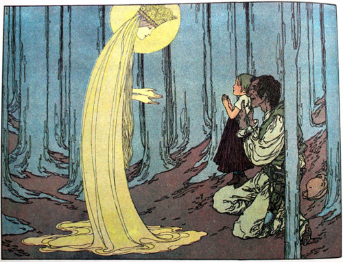 The English translation of the title is The Virgin Mary’s Child. The ever-misfortunate woodcutter is approached by the Virgin Mary, who offers to lift from him the burden of his young daughter. The girl is given over to her without a question. The child grows up in heaven with little angels as her playmates. When the child reaches the age of fourteen, Mary entrusts her with the keys to the thirteen doors of heaven. Allowed to enter twelve of the rooms, in each of which she finds an apostle, the thirteenth room she is forbidden to enter. As with all forbidden rooms in fairy tales it must be opened. She barely puts the key in the lock, when it flings open, terrifying the girl with the sight of the Holy Trinity.