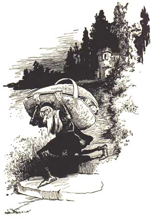 Appearing to have passed the test, the bride now demands the sorcerer carry a basket of gold to her parents before the wedding. In the basket she conceals her sisters, instructs the sorcerer/bridegroom not to rest or tarry, and says that she will be watching him from a window. She puts a decorated skull in the attic window as her decoy, but it is her sisters’ voices from inside the basket that goad the carrier on, allowing him no rest.