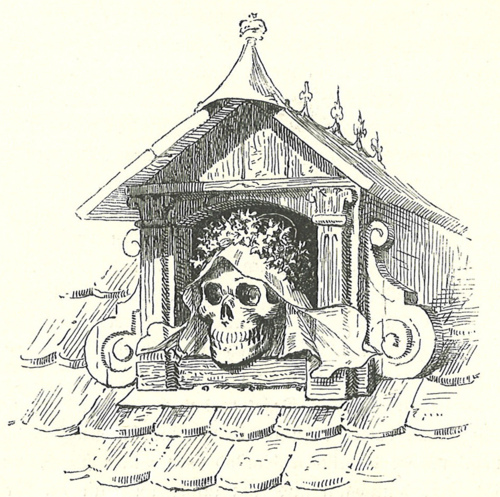 A skull looks out the attic window, one that she has decorated with jewels and flowers as a decoy.