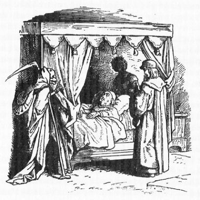 Armed with this knowledge, the godson becomes a great and wealthy physician. However, when the godson is summoned to cure the king, he sees Death at the foot of the bed. Instead of allowing Death to take the king, the physician turns the king around on his bed so that Death is standing at the king’s head.