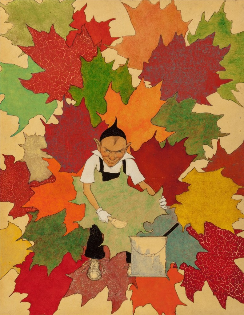 The spritely Jack Frost that we know appears to have come out of the early nineteenth century. He is elvish and mischievous but not to be feared as is the character of our Russian tale. The English Jack Frost will nip your nose, cheeks, and ears but nothing worse. He is also assigned to paint the leaves on trees with their fall colors. I stumbled across a painting by Maxfield Parrish of Jack Frost at this task, the work labeled as a self-portrait.