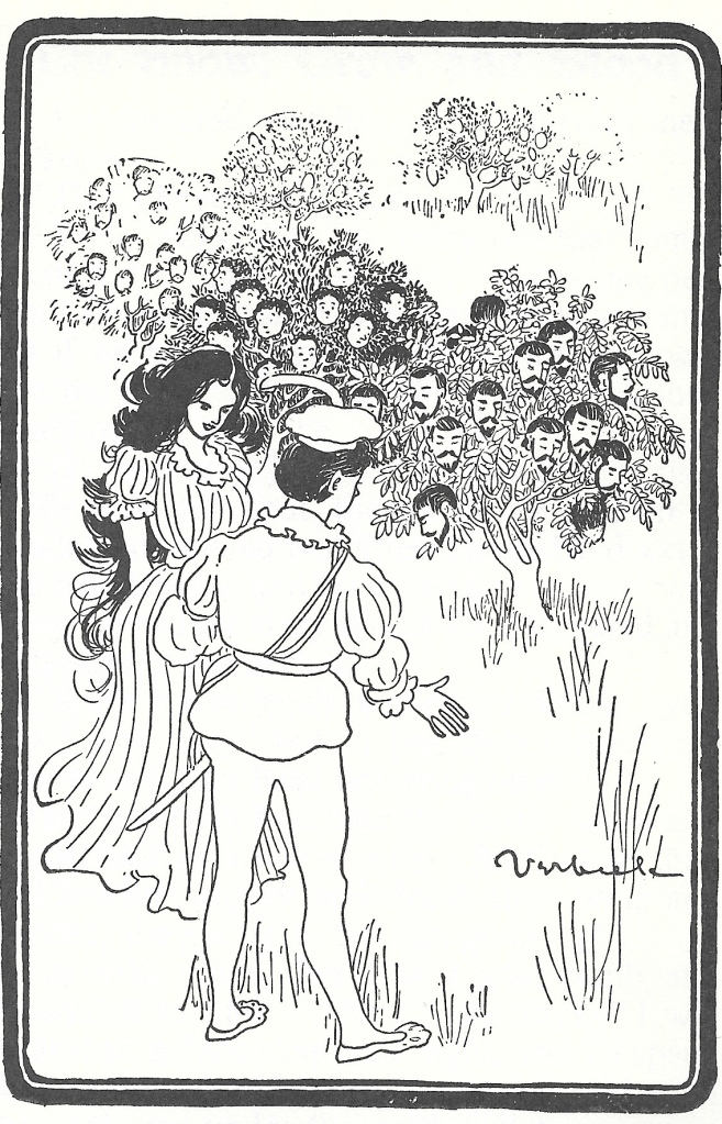 They made a fine showing. Their gold-shod horses jumped the castle wall. They showered the people with gold coins. The Princess of the East called Jack to her and gave him the challenge of three tasks if he wished to marry her. As proof that failure insured the aspirant’s death, she showed him the Rose Garden of the Heads. There were three hundred and sixty-five rosebushes, three hundred and sixty-four of which had a prince’s head as its blossom. She desired Jack’s to be the three hundred and sixty-fifth.