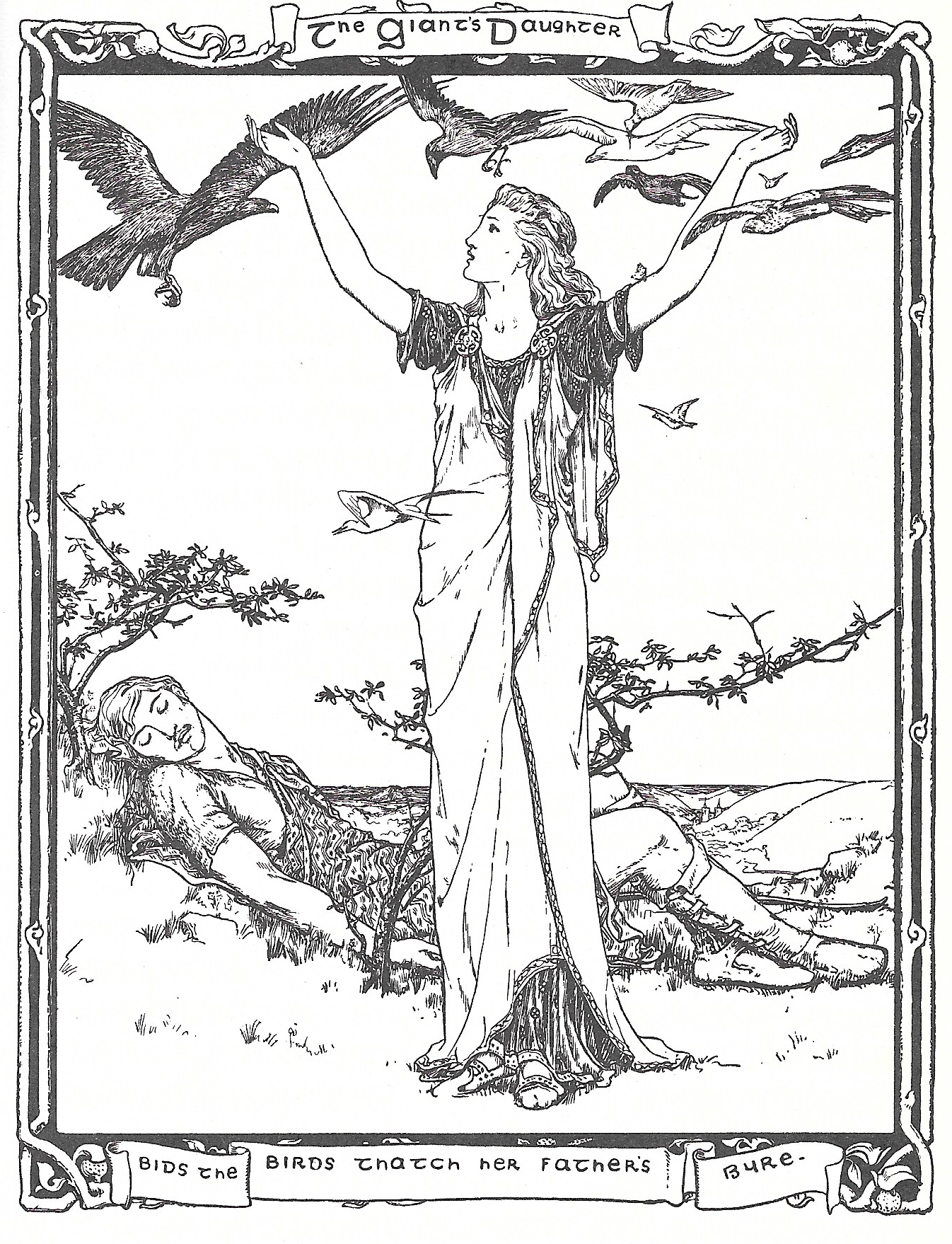 “King’s son’s choice of Auburn Mary angers the giant. He puts upon him the tasks of cleaning the stable, thatching its roof with down feathers, and climbing a tree for magpie eggs. Auburn Mary aids him. Extreme is having the king’s son kill her, strip her flesh, and use her bones as pegs to climb the tree for the eggs. He then reassembles her by her instructions but loses her little-finger bone. That becomes useful when the giant again tries to deceive him by having him choose between the three identically clothed sisters. His bride is the one with nine fingers.
