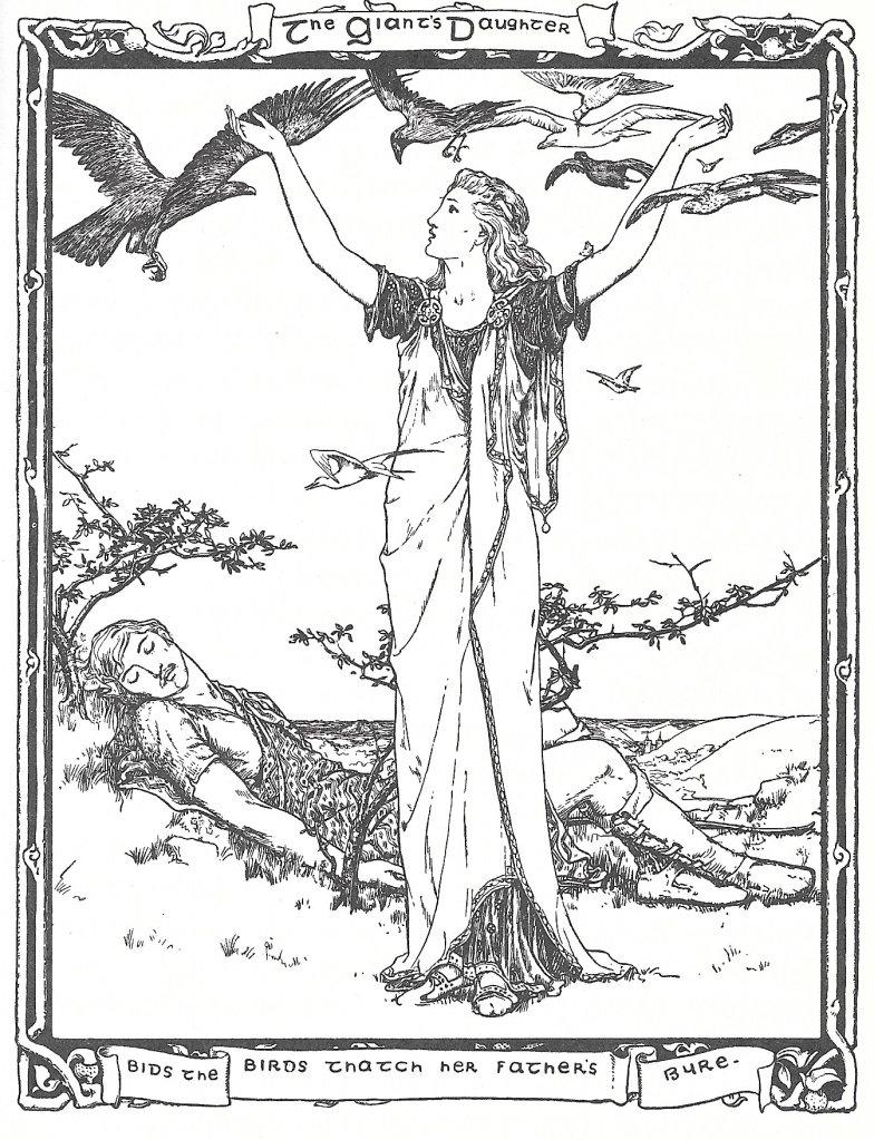 “If I recall,” I say, straining the capacity of giant thinking, “this version was concocted by Joseph Jacobs, borrowed from Andrew Lang, who collected it somewhere in Scotland, but it is pretty clear that much of the story leans on Greek mythology.”