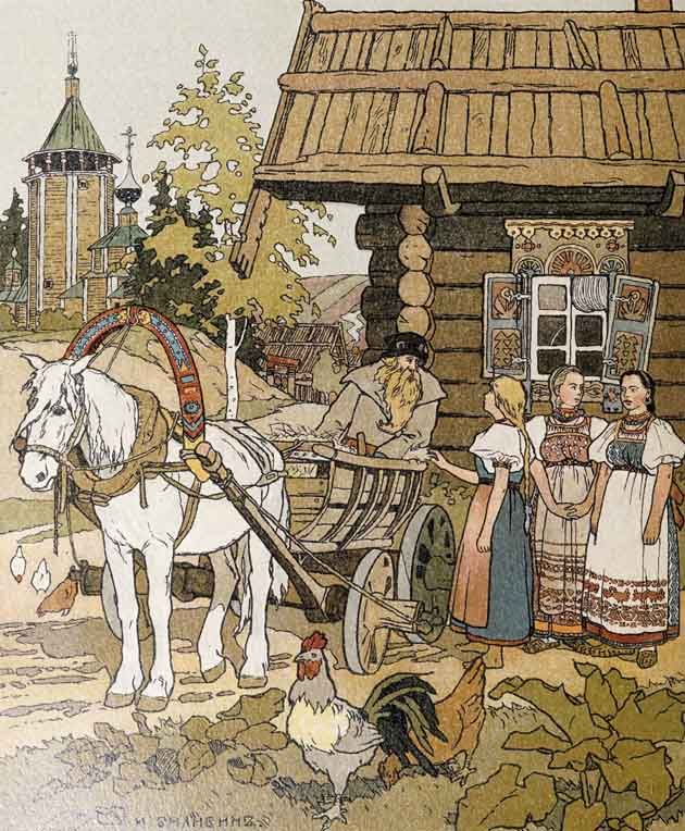 “When the third set of iron and stone is worn away, the ball rolls to the third witch’s hut. There, the girl gets a golden embroidery frame and a magical needle that embroiders by itself. The witch also explains that Finist is now married to a wafer baker’s daughter, and that the girl needs to become a servant in the household if she wishes to win her beloved back again.