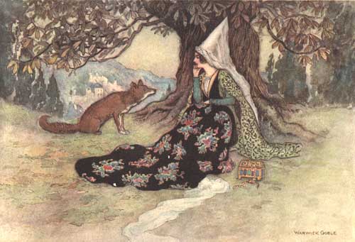That evening, nearly heartbroken, Grannonia slips from the castle disguised as a peasant to search for her would-be husband. She is befriended by a fox, who translates the story that the birds around them are singing, which is her story, and that the dove, actually a prince, is gravely wounded.