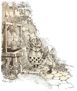 The hairy man, who calls himself Iron Hans, sets the lad the task of guarding a well, not allowing anything to touch the water. Unfortunately the lad’s finger, injured while opening the cage, throbs, and he dips it into the water to soothe it. The finger turns to gold. By the end of the third day the lad has a whole head of golden hair. Iron Hans sends him away to learn poverty, but with the promise to help the lad if he is in need and calls for him.